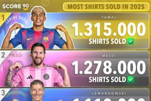 体育资讯11月28日讯 Score 90统计了2025年截至目前世界足坛的球员球衣销量榜,亚马尔以131.5万件排名第一,梅西第二,C罗位列第七。