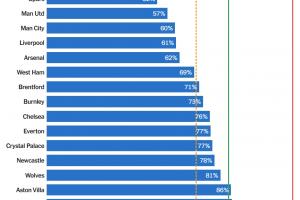 英超本赛季阵容成本比例预估:布莱顿49%最健康,热刺曼联排二三