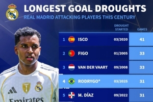 新世纪皇马攻击手最长进球荒榜:*当前仍未结束