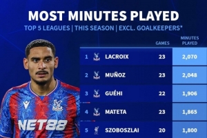 本赛季五大联赛非门将出场时间榜:水晶宫占据前4,姆巴佩第8
