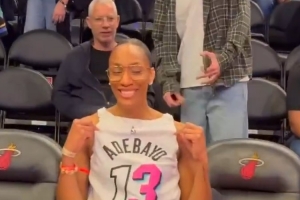赛前,阿德巴约女友、本赛季WNBA总冠军并包揽DPOY、MVP和FMVP的阿贾·威尔逊身穿男友球衣现场观战,前后反穿专门露出阿德巴约的名字与号码。