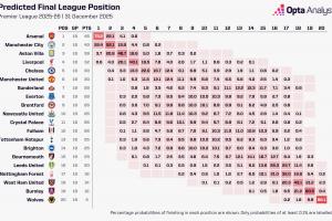 opta预测英超夺冠概率↓