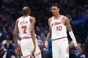 据ESPN统计,在过去7场比赛中,火箭每场至少出手20次三分但每场比赛的三分命中率都低于30%,NBA历史首队!