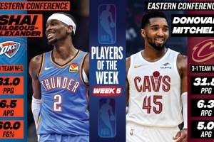 体育资讯11月25日讯 今日NBA官方宣布,亚历山大和米切尔分别当选25-26赛季第5周西部和东部周最佳球员。