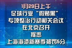 体育资讯01月29日讯 五星体育消息,1月29日上午,足球行业“假赌黑”专项整治行动的相关会议在北京召开。据悉,上海海港俱乐部新赛季被罚5分。