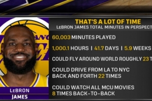 詹姆斯生涯至今出战60003分钟,可以换算为1000.1小时、41.7天、5.9周,能够坐飞机环绕地球23圈,能够开车从洛杉矶到纽约往返22次,可以连续8次观看《复仇者联盟》系列电影