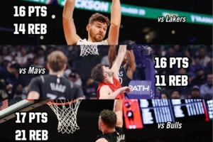 赛后,开拓者官推晒出克林根近五场两双的数据图,并写道:“得分?篮板?他全都要。克林根最近的表现(如图),包括五次两双。”