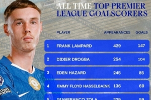 体育资讯2月7日讯 在本轮英超切尔西对阵狼队的比赛中,帕尔默点射双响,为球队在英超打进43球,超越特里升至队史英超射手榜第8,以下为具体榜单: