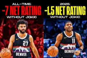 历史上,没有约基奇在场时,掘金队的表现常常会拖累全队,净效率值通常会降到-7.0甚至更低。