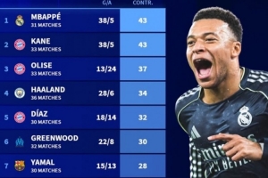 体育资讯2月10日讯 《转会市场》也统计了五大联赛球员本赛季各项赛事参与进球情况,姆巴佩和凯恩43球并列最多。