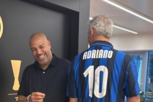 体育资讯2月12日讯 前国米球星阿德里亚诺继上周造访国米训练中心后,今天他又造访了国米总部。一同前来的还有他的两个女儿拉拉和索菲,以及前队友托尔多。