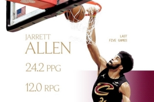 体育资讯2月13日讯 今日,骑士官方在社交媒体晒出了球队中锋贾勒特·阿伦过去5场比赛的数据。