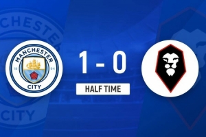 上半场伤停补时2分钟,半场结束,曼城暂1-0索尔福德城。