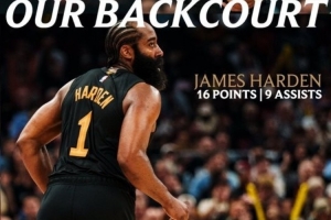 赛后骑士官推发布后场双枪数据海报,米切尔本场比赛拿到17分5助攻,哈登16分9助攻。