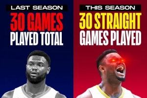 体育资讯2月20日讯 据统计,锡安赛季至今共计出场40场比赛,且已经连续出场了30场比赛。