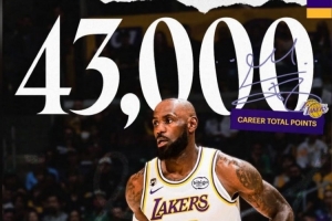 本场比赛,詹姆斯得到20分4篮板5助攻2抢断1盖帽。个人常规赛生涯总得分突破了43000分里程碑。